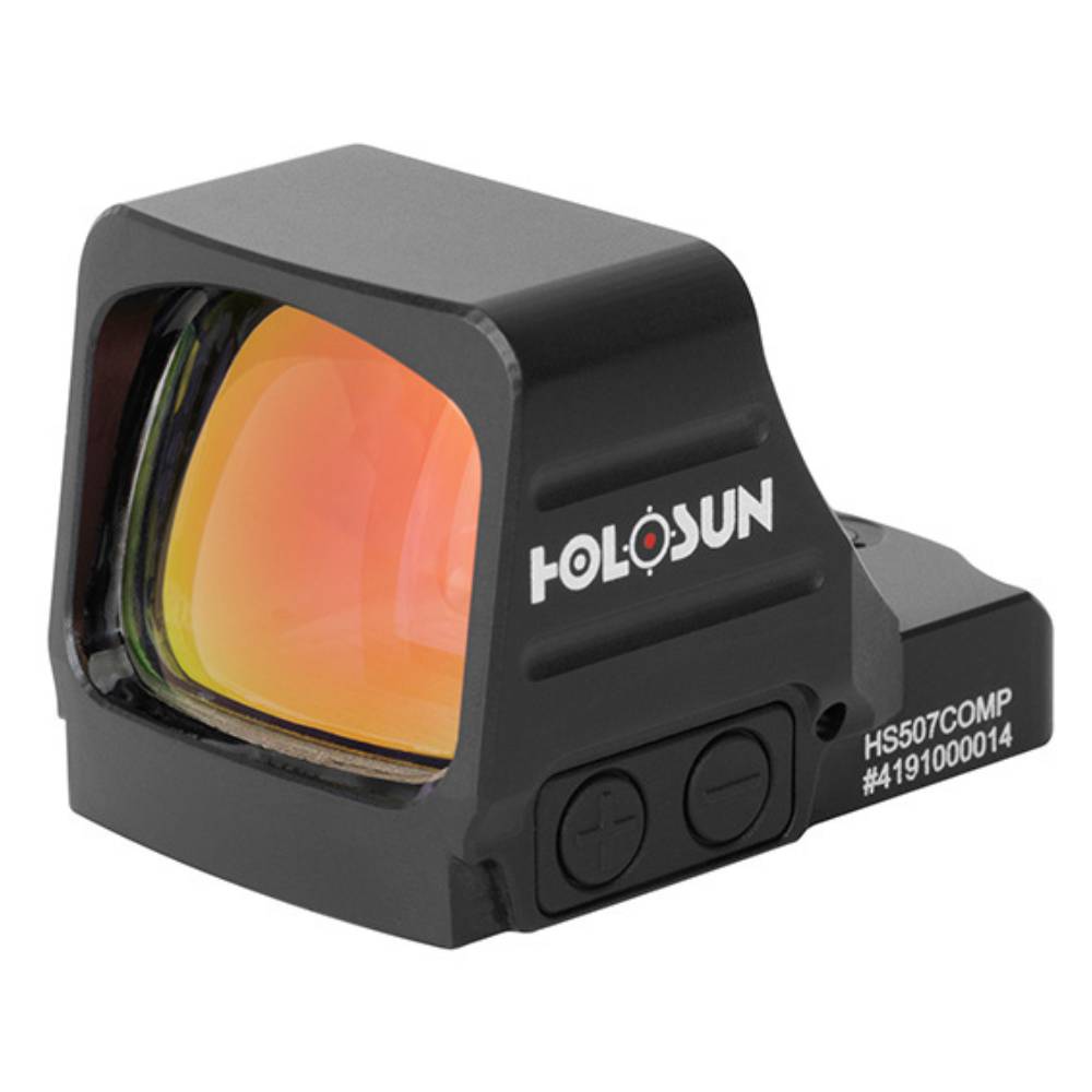 The Holosun 507COMP is a competition-oriented pistol red dot with an oversized 1.1" x 0.87" objective lens for a wide, clear sight picture. Its Competition Reticle System (CRS) offers a 2 MOA dot with selectable 8, 20, and 32 MOA circles to match any shooting scenario. Built from 7075 aluminum on an RMR footprint with up to 50,000 hours of battery life and Shake Awake technology.