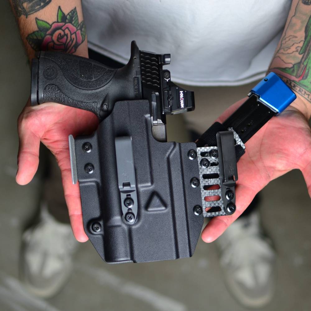 The Jingo is a universal light-based Kydex holster that fits nearly any 9mm or .40 cal pistol using weapon-light retention. It features a Tegris-backed body that flexes with your movement, Discreet Carry Concepts clips, and the included Wizard Sleeve carrier for mags, tourniquets, or multitools. Optic-ready, fully adjustable, and made in the USA.